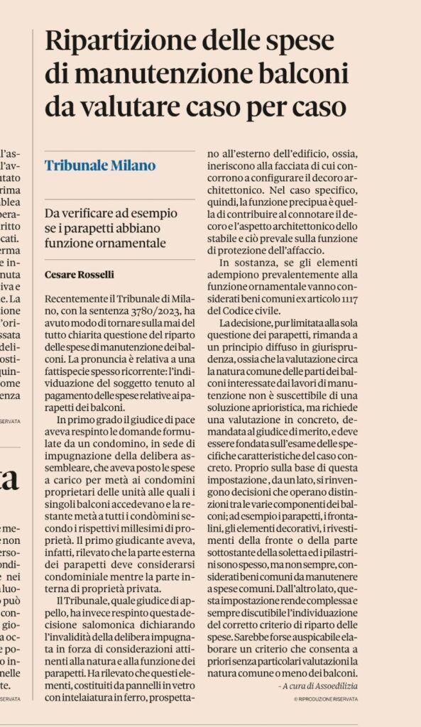 Ripartizione delle spese manutenzione balconi da valutare caso per caso